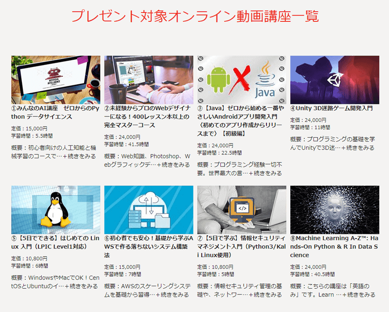 12月20日までに新規登録した方先着100名にUdemyのオンライン講座をプレゼントする企画で、数ある講座の中から当社講座含む8講座がセレクション頂きました。